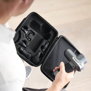 Massagepistolen förbättrar professionella massagebehandlingar på ett särskilt effektivt sätt. Tack vare sin låga vikt och ergonomiska design ligger Physio Boost Pro bekvämt i handen medan det halkfria handtaget garanterar ett säkert grepp. Massagepistolen är särskilt tyst och intuitiv att använda. Med fem intensitetsnivåer och fem olika massagetillbehör erbjuder ett brett utbud av alternativ för individuellt anpassade behandlingsmetoder. Den medföljande väskan gör att massagepistolen och tillbehören kan förvaras säkert, bekvämt transporteras eller förvaras i praktiken.